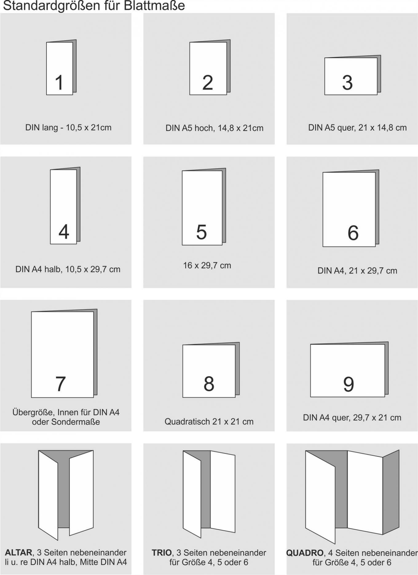 Drei- oder Vierteiler. ALTAR, TRIANGOLO oder QUATRO - aufklappen und alles auf einen Blick nebeneinander. Neu ALTAR-5F hat zusätzlich auf der Vorder- und Rückseite noch Einschubseiten.